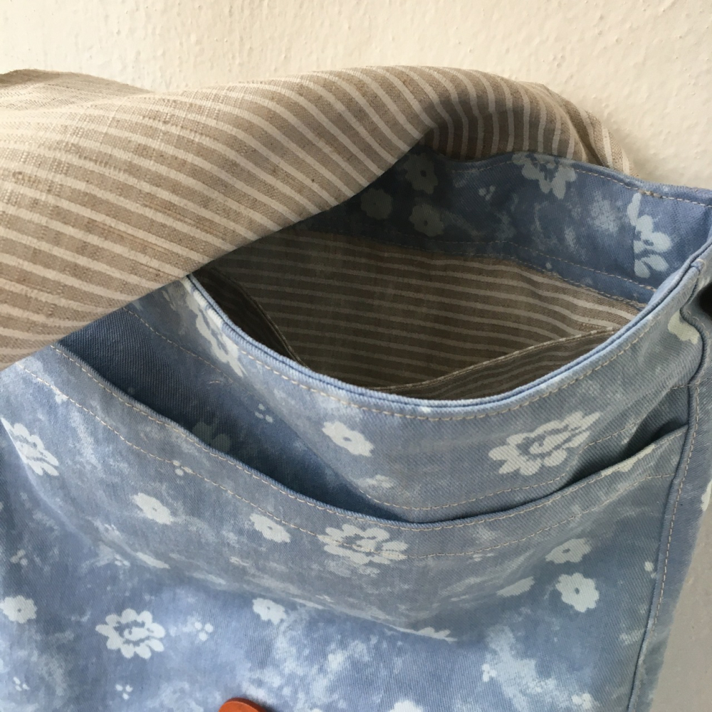 Vonkajšia látka je svetlomodrý denim s kvietkami a vnútro je bielo-béžová ľanová látka s 20% polyesterom.