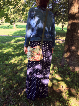 Vonkajšia látka je smotanová polopanama s kvetmi a vnútro je khaki bavlnená látkas bodkami.