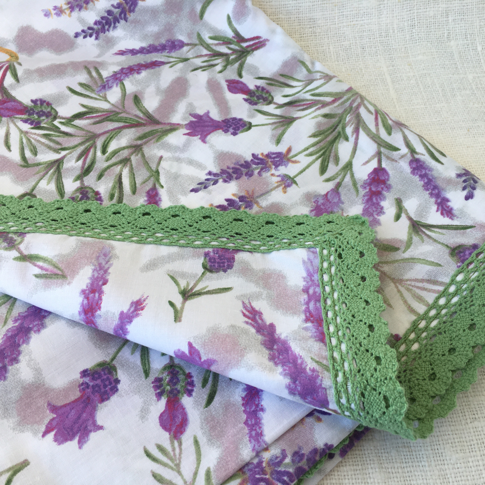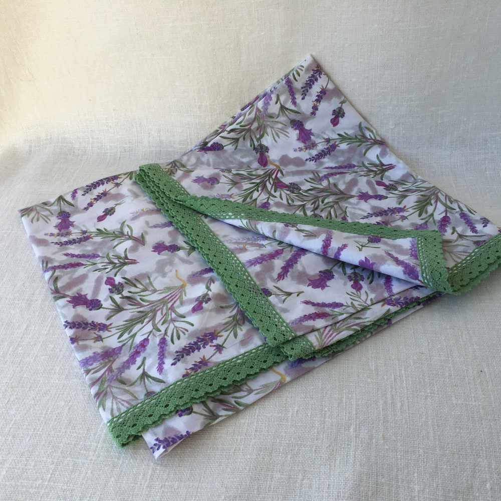 Obrus s krásnym vzorom levandulí. Ušitý je z opratej látky zo 100% bavlny. Látka je jemnejšia a padavá. Lem je zahnutý a ozdobený farebne ladiacou cca 3,5 širokou čipkou.