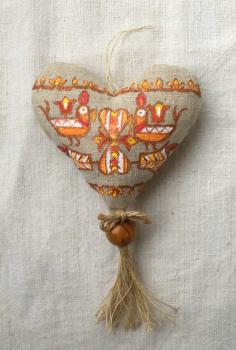 Srdiečko je ušité z poloľanu a bohato ozdobené ručnou maľbou so slovenským ľudovým motívom z oblasti Nitrianskeho Pravna.