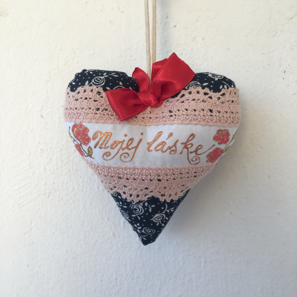 Srdiečka sú ušité z opratej bavlnenej látky a ozdobené čípkou. Na našitom bielom pruhu z bavlneného saténu je ručne napísaný text a dozdobený ručnou maľbou. Každé srdiečko je mierne odlišné a môžete si vybrať, ktoré vám padne do oka.