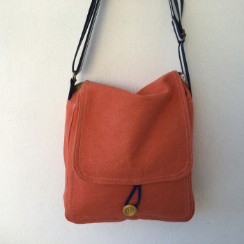 Vonkajšia látka je oranžový denim a vnútro je bavlnená látka, kombinované bielo-okrové káro s horčicovou.