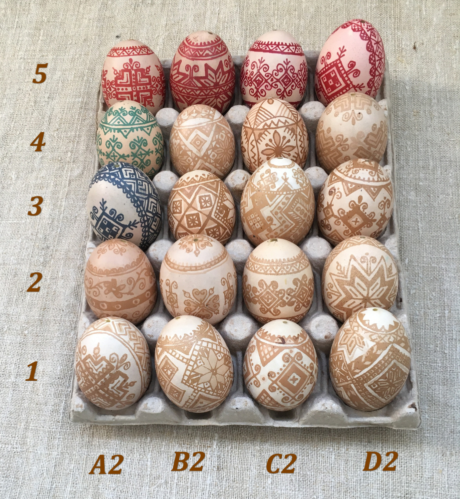 Cena je za 1 kraslicu. Do košíka vložte počet kusov a do poznámky napíšte, ktoré ste si vybrali, napríklad C5 + D2 ... atď. Alebo skopírujte obrázok, zakrúžkujte a pošlite mi do správy.