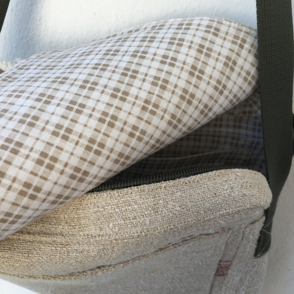 Ucho je z bavlneného popruhu farby khaki a dĺžku si upravíte si, ako potrebujete. Popruh má dĺžku skoro 1,5 m. Buď zavesíte na plece, alebo krížom cez telo. Kabela môže ležérne ležať na zadnej časti vášho tela.