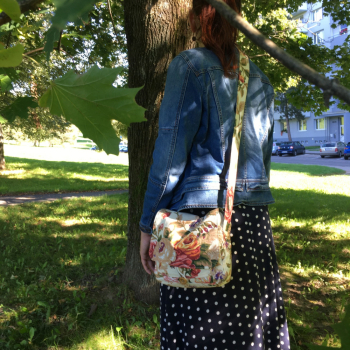 Ucho - upravíte si, ako potrebujete. má dĺžku skoro 1,5 m. Je z látky, ako celá kabela. Kabelu buď zavesíte na plece, alebo krížom cez telo. Kabela môže ležérne ležať na zadnej časti vášho tela.