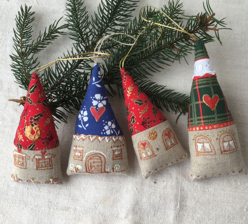 Domčeky sú obojstranné, na zadnej strane je želanie Požehnané Vianoce. Každý je niečím iný. Dokončené sú ručným šitím a dajú sa jemne oprať.