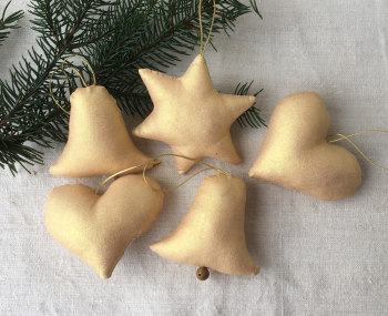 Dekorácie sú ušité z bavlny so zlatou potlačou. Na zvončeku je korálka z jaspisu.