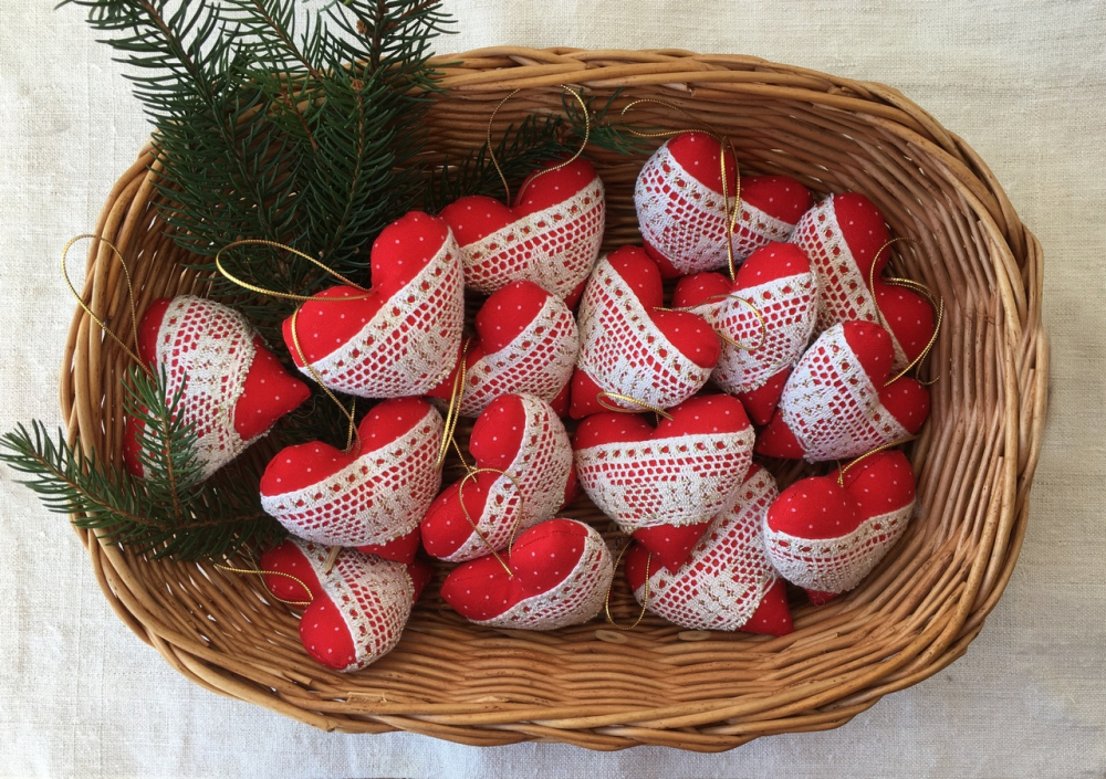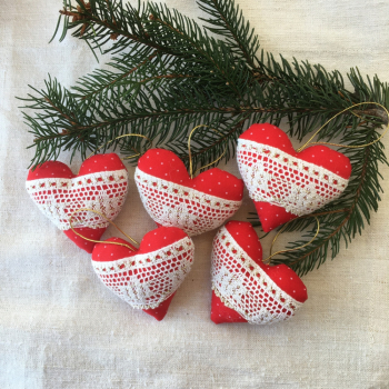 Dekorácie sú ušité z opratej červenej bavlny s bielymi bodkami. Ozdobené su bielo-zlatou bavlnenou čipkou.