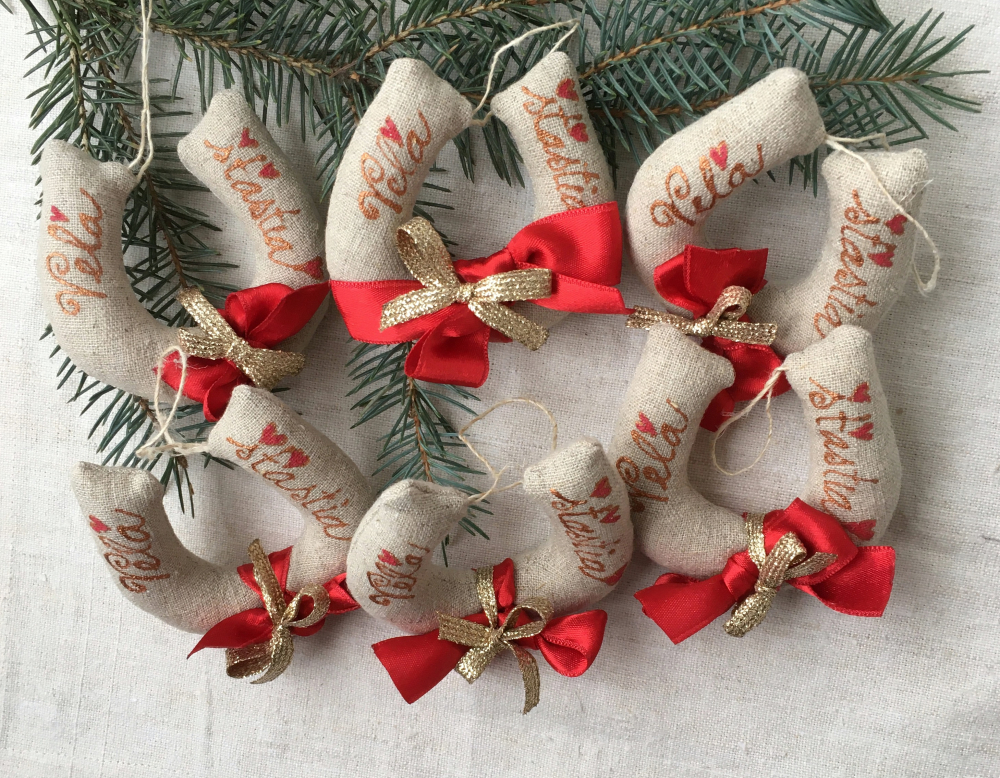 Vyplnené sú syntetickým rúnom. Kúsky sa vešajú na ľanovú šnúrku.
