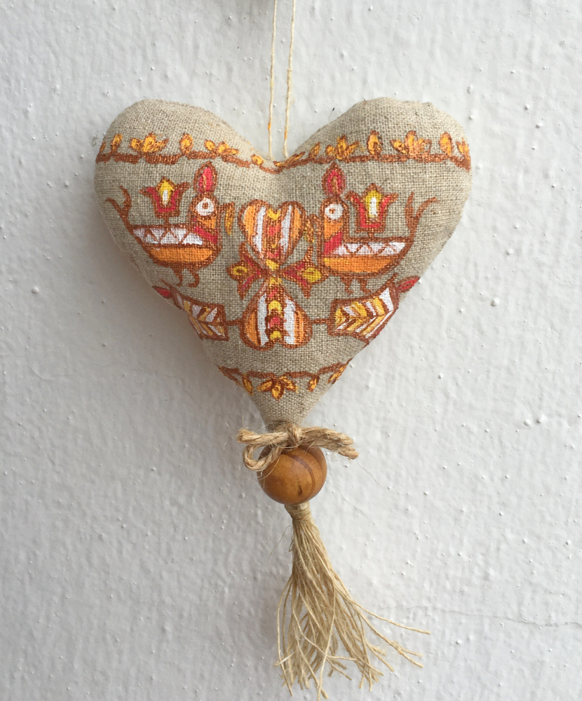 Srdiečko je ušité z poloľanu a bohato ozdobené ručnou maľbou so slovenským ľudovým motívom z oblasti Nitrianskeho Pravna.