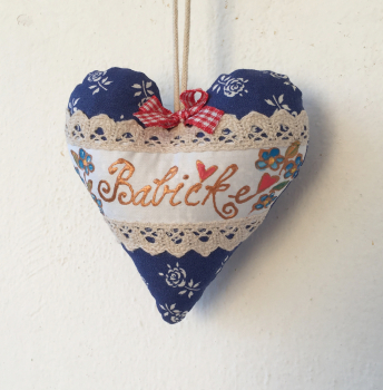 Srdiečka sú ušité z opratej bavlnenej látky a ozdobené čípkou. Na našitom bielom pruhu z bavlneného saténu je ručne napísaný text a dozdobený ručnou maľbou. Každé srdiečko je mierne odlišné a môžete si vybrať, ktoré vám padne do oka.
