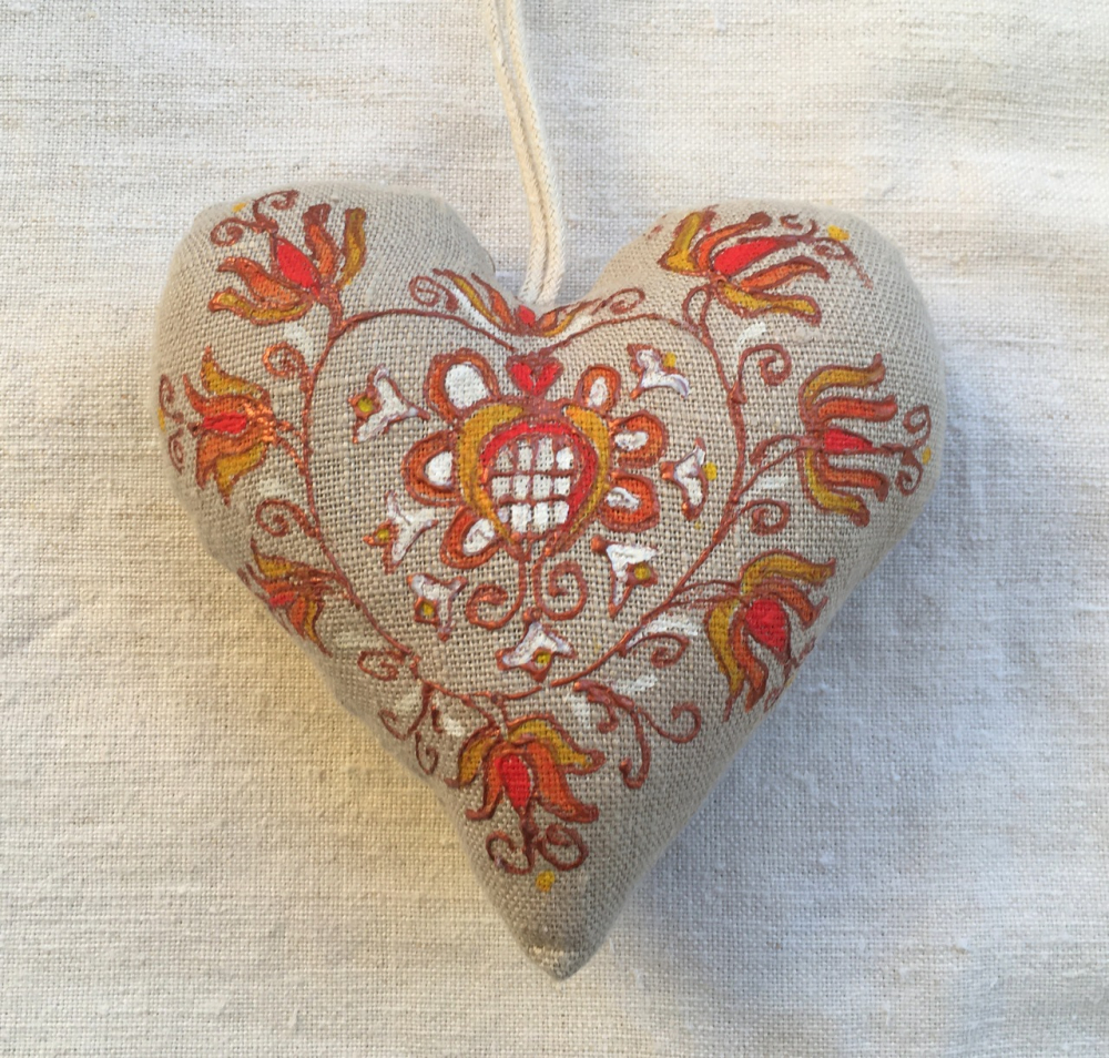 Srdiečko je ušité z opratej ľanovej látky a ozdobené ručnou maľbou s motívom slovenského ornamentu.