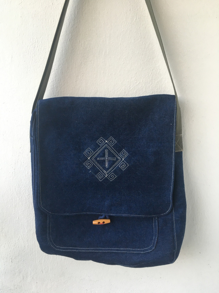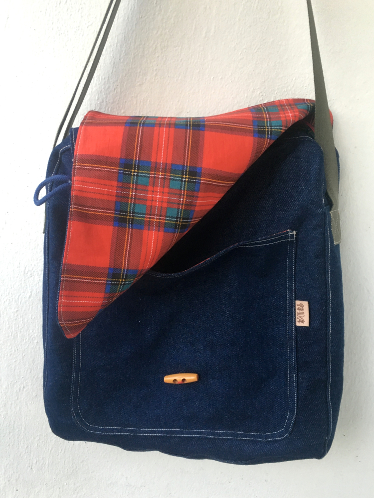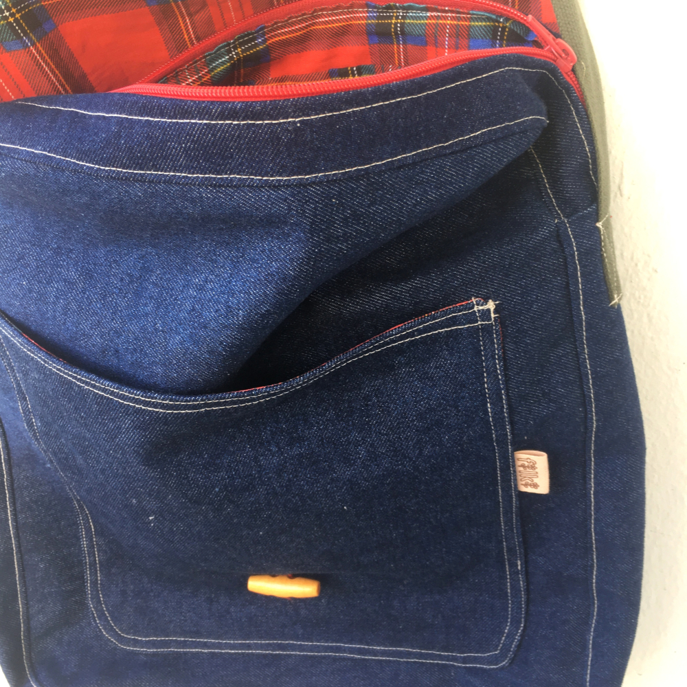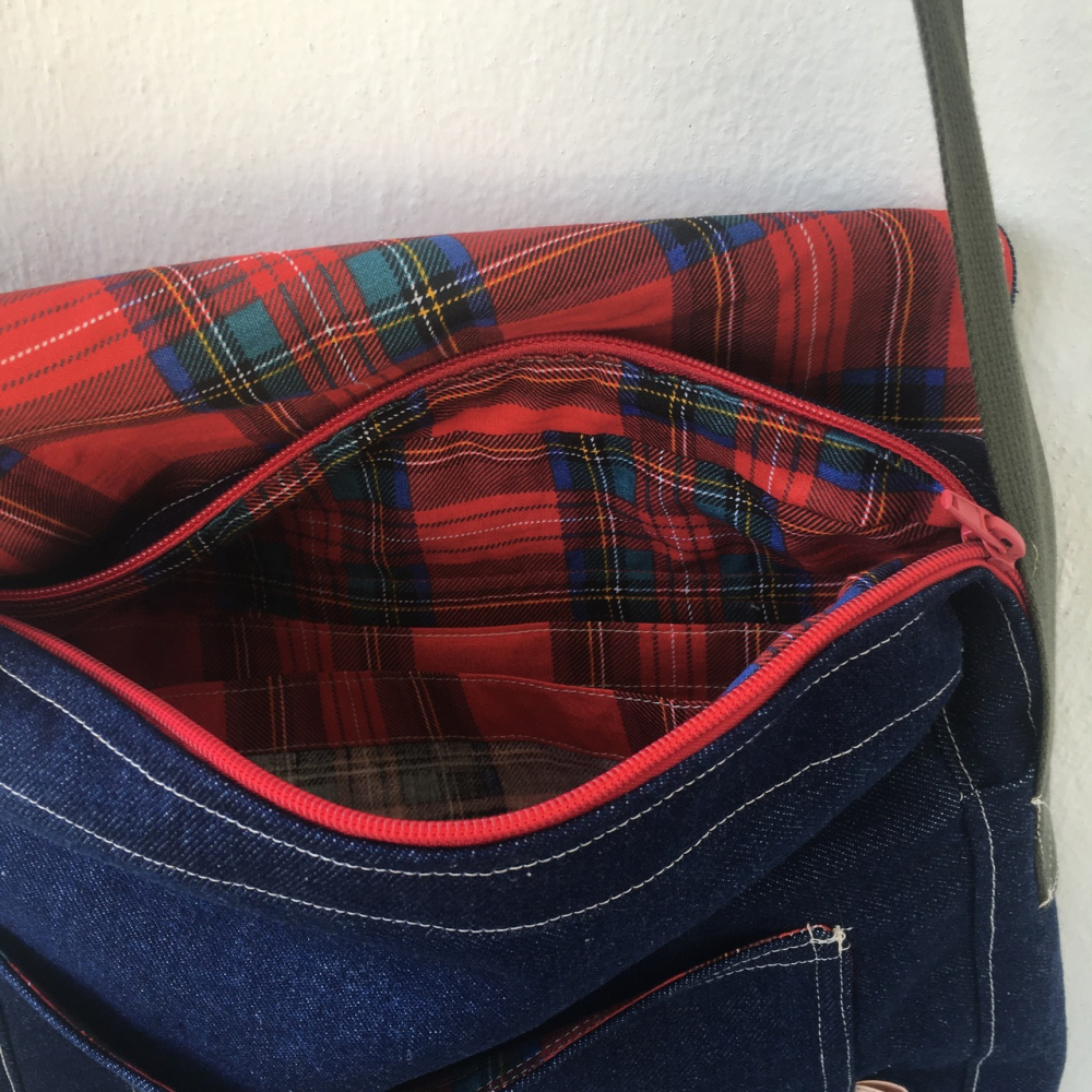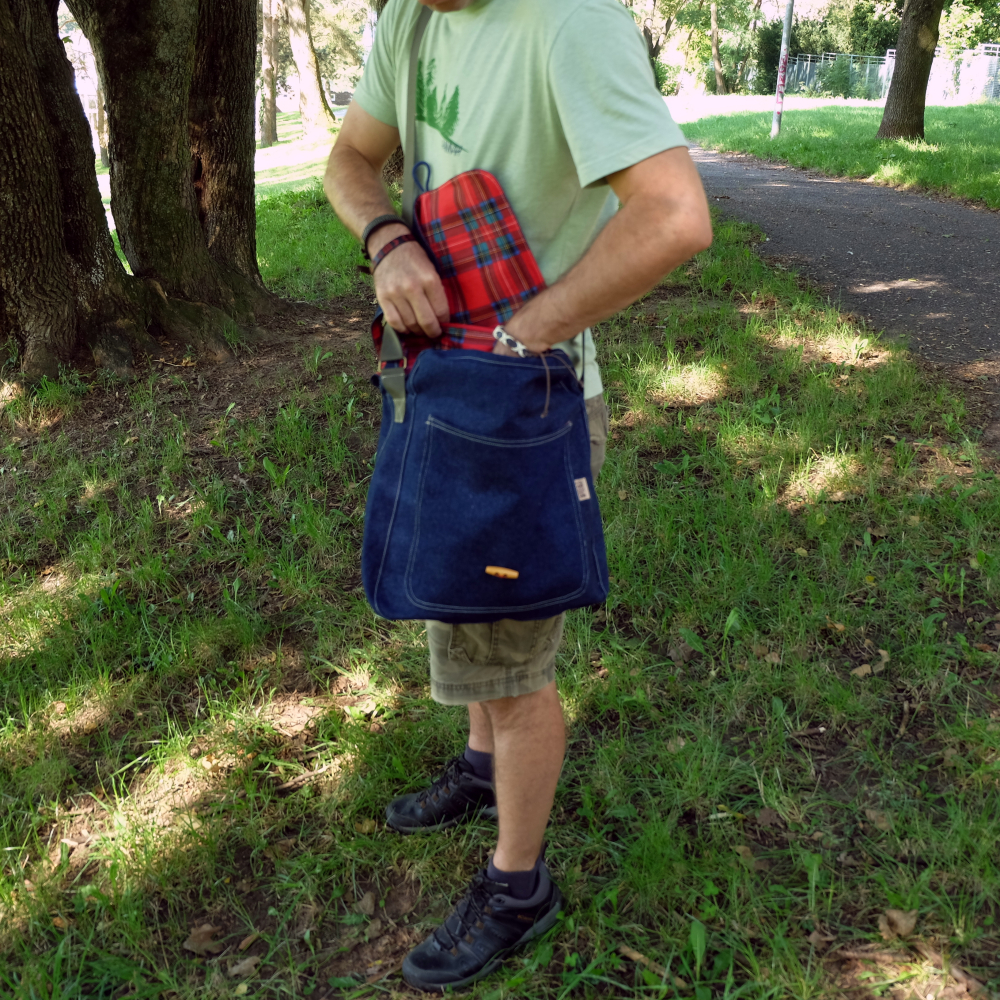 Vonkajšia látka je tmavoomodrý denim a vnútro je červená károvaná bavlnená látka.
