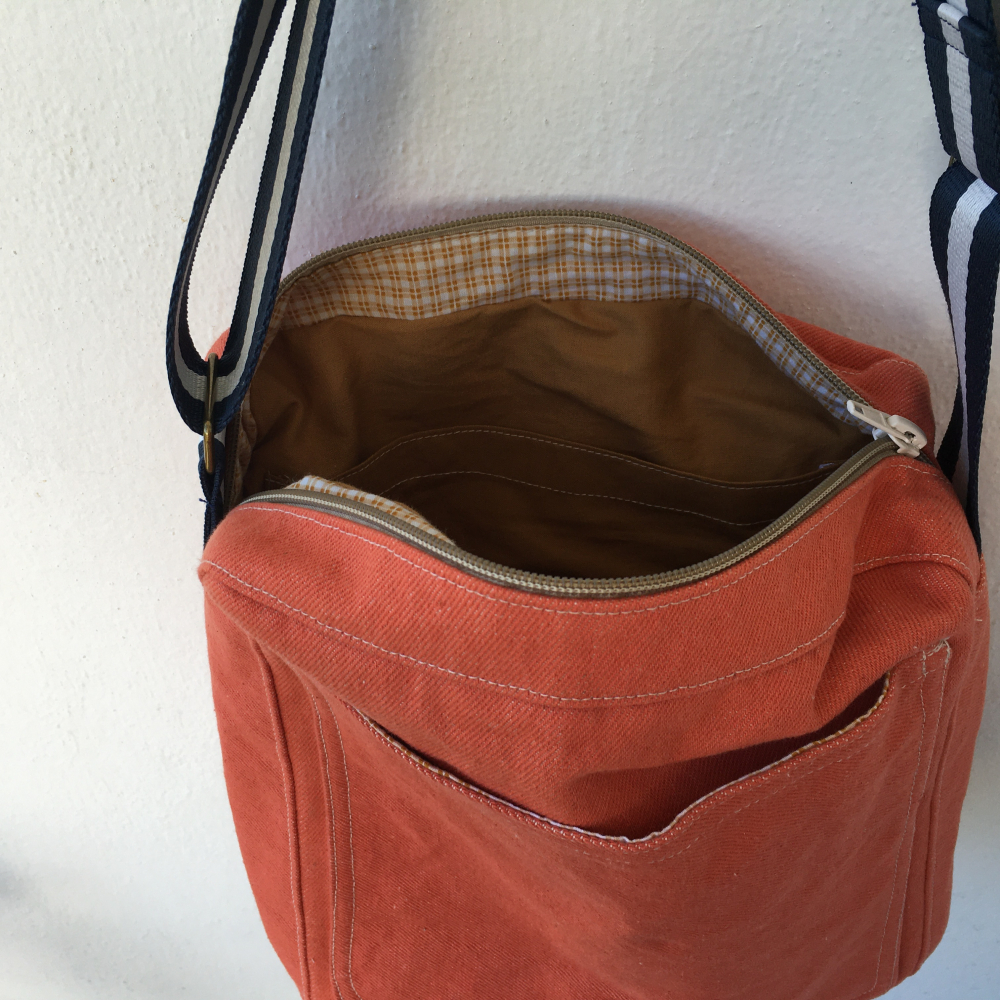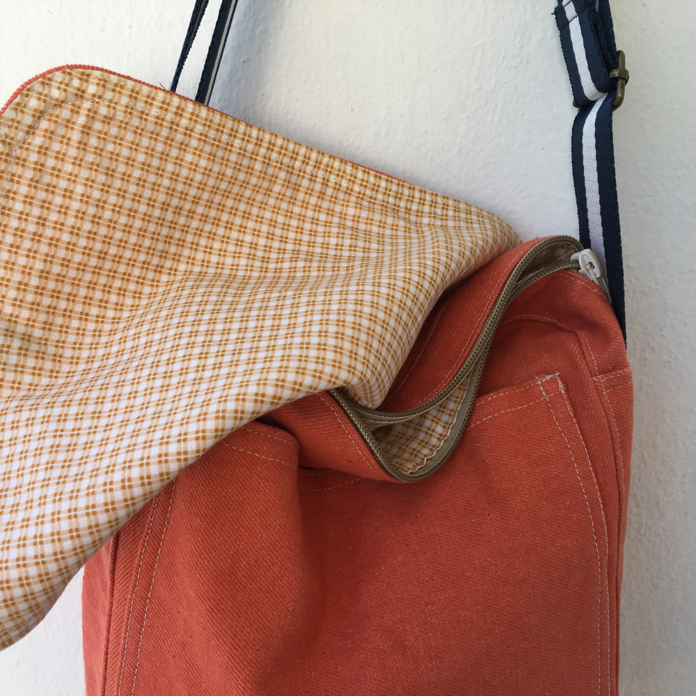 Vonkajšia látka je oranžový denim a vnútro je bavlnená látka, kombinované bielo-okrové káro s horčicovou.